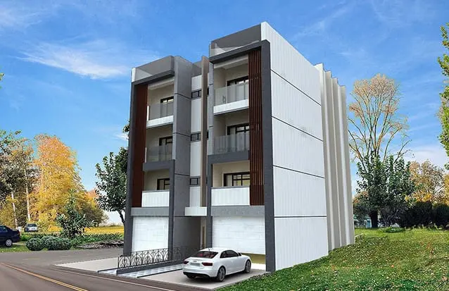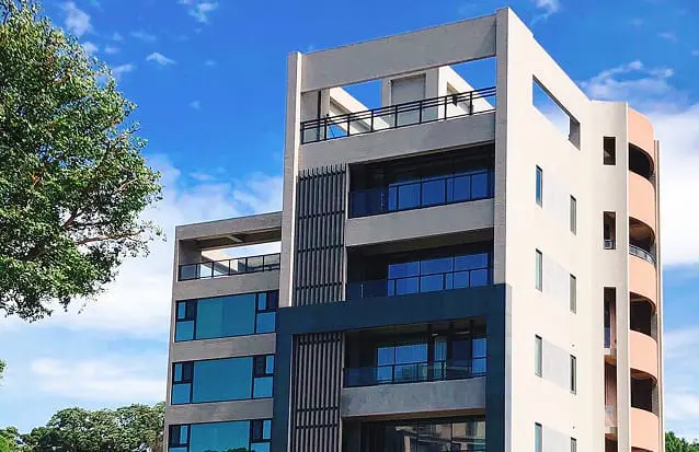 垂直水平交錯設計,勾勒俐落建築線條。石材基座穩重大器,灰白階外牆搭配格柵語彙,展現現代建築美感。
